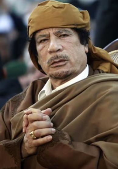 Muammar Gaddafi (1942) gobernó Libia desde 1969 hasta 2011, instaurando un régimen autocrático y un culto a su personalidad. Se le responsabiliza de violaciones sistemáticas a los derechos humanos y de patrocinar el terrorismo internacional. Su poder se sostuvo mediante la represión y el uso de la fuerza.